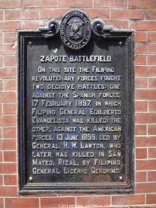 ON THIS SITE THE FILIPINO REVOLUTIONARY FORCES FOUGHT TWO DECISIVE BATTLES: ONE AGAINST THE SPANISH FORCES, 17 FEBRUARY 1897, IN WHICH FILIPINO GENERAL EDILBERTO EVANGELISTA WAS KILLED; THE OTHER, AGAINST THE AMERICAN FORCES, 13 JUNE 1899, LED BY GENERAL H. W. LAWTON, WHO LATER WAS KILLED IN SAN MATEO, RIZAL, BY FILIPINO GENERAL LICERIO GERONIMO.